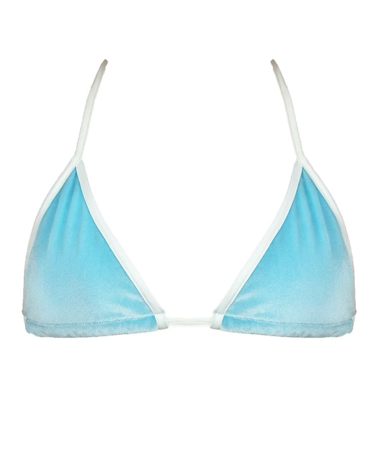 Our "Velvet" Collection features quick-drying fabric properties with adjustable white straps designed to flatter. The "Naomi" features a baby-blue velvet. Made with love in London.
