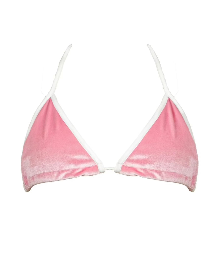 Our "Velvet" Collection features quick-drying fabric properties with adjustable white straps designed to flatter. The "Cara" features a blush-pink velvet. Made with love in London.