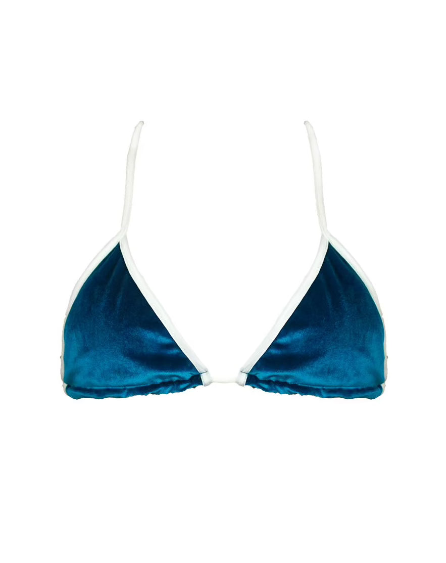 Our "Velvet" Collection features quick-drying fabric properties with adjustable white straps designed to flatter. The "Naomi" features a teal-blue velvet. Made with love in London.